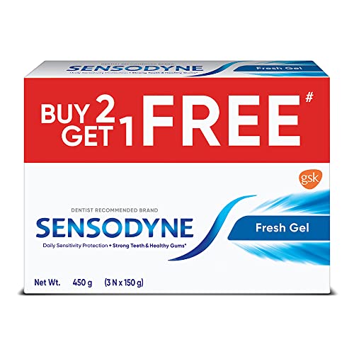 When the protective layer of teeth (enamel) is worn away or gums recede, the dentine underneath becomes exposed. When the exposed dentine comes in contact with hot, cold, sweet or sour food and drinks, it can trigger a sharp short sensation called tooth sensitivity. Sensodyne Fresh Gel is a daily fluoride toothpaste that helps protect against tooth sensitivity, while still providing the benefits of a regular paste like strong teeth and health gums. It also has a cool refreshing taste that leaves your mouth feeling fresh and clean. With twice daily brushing, you can enjoy your favorite foods and drinks without the worry of sensitive teeth. Sensodyne Fresh Gel tooth paste is available in four packs – 75 gm, 150 gm, 450 gm (150 gm * 3) and 450 gm (150 gm – Buy 2 Get 1 free) combo pack. Always follow instructions and guidance included on the pack before use.